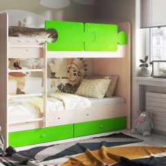 Конструкция кровати предусматривает два спальных места размером 90*190 см каждое. Верхнее спальное место защищено бортиками. Прочную лестницу с широкими ступенями можно установить справа или слева.